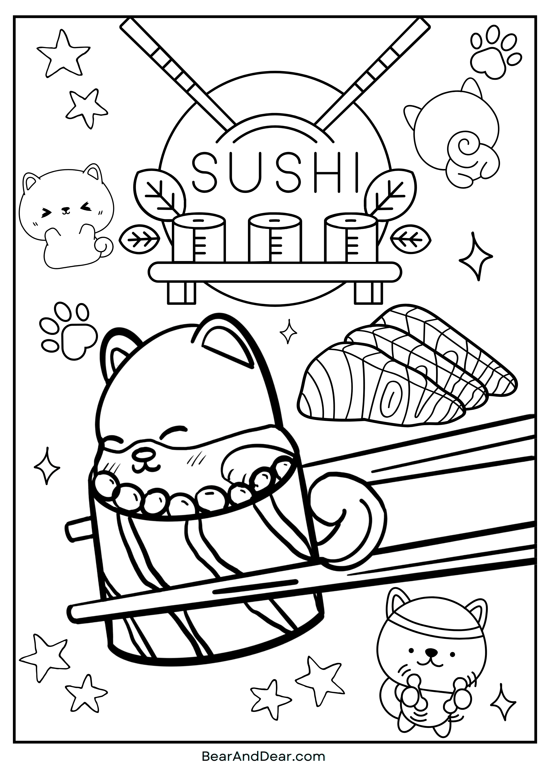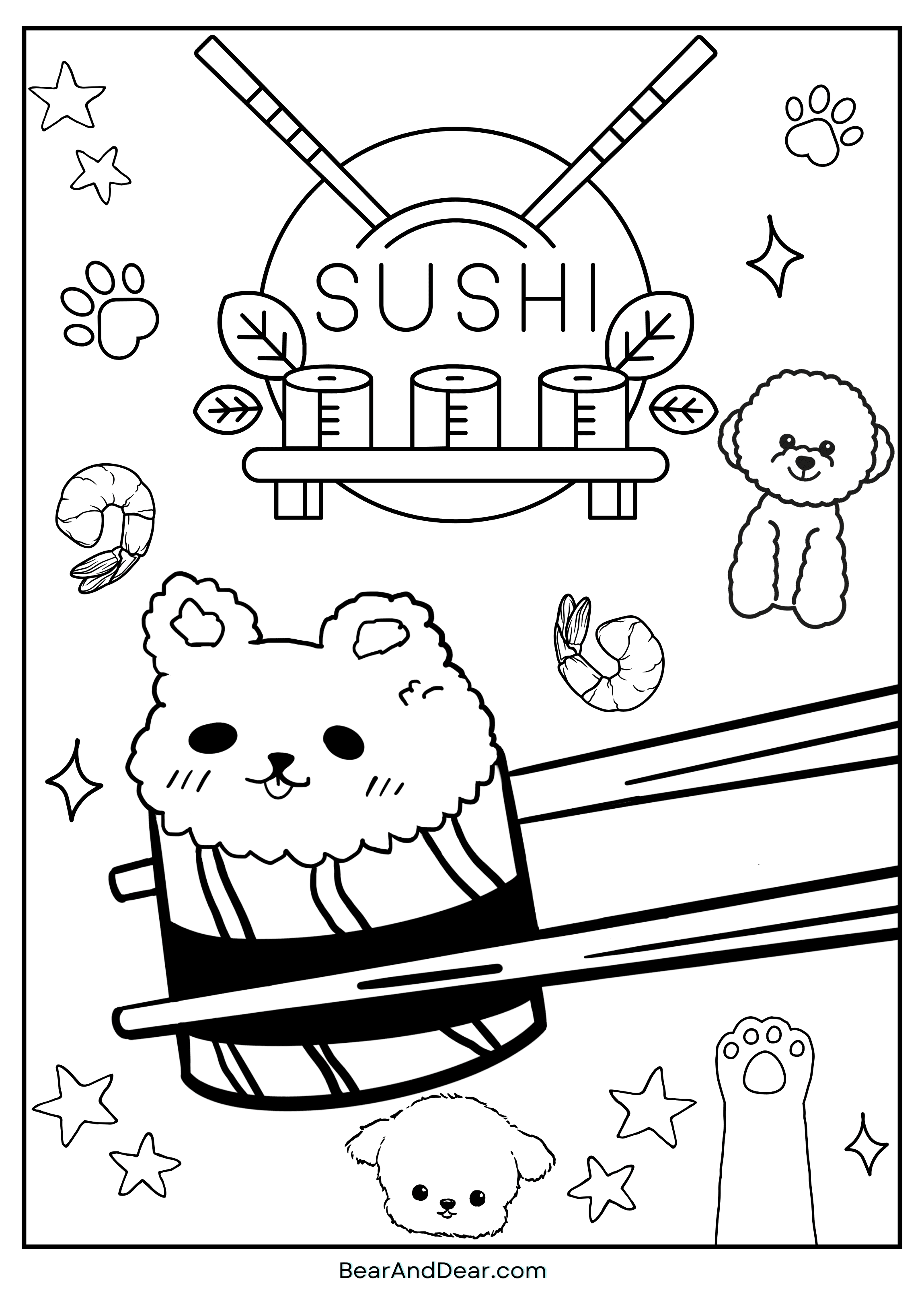 This kawaii Inu(dog) sushi coloring page is the cutest overload! With the sweet pea necklace, this dog sushi is ready to roll.
