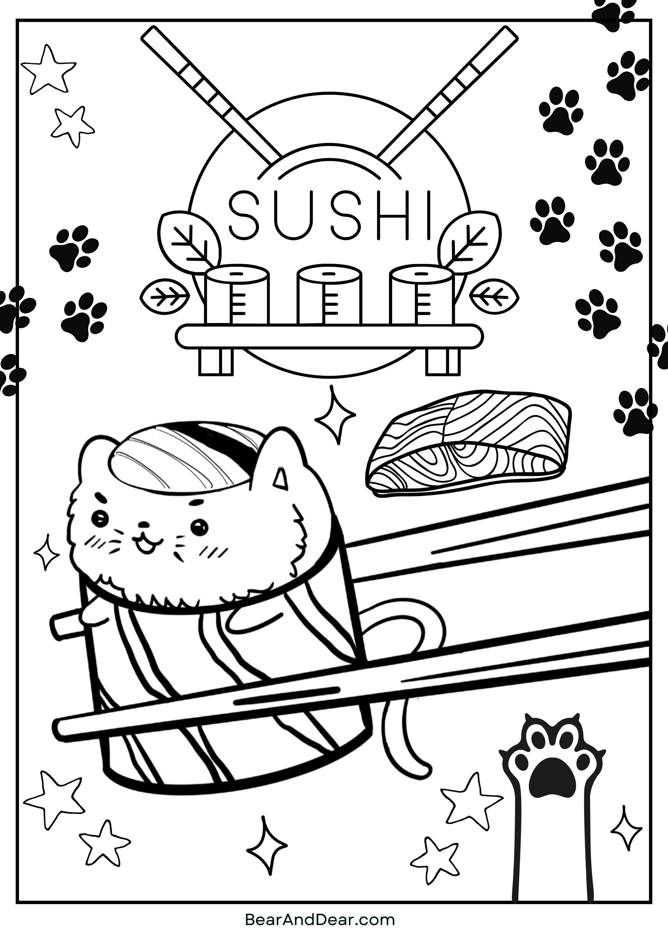 In the purr-fect Sushi Cat World, fresh fish is sushi cat favorite. This cute sushi cat is wearing the salmon hat to greet you at the sushi shop. This design brings a touch of cat paws and stars to your coloring adventure.