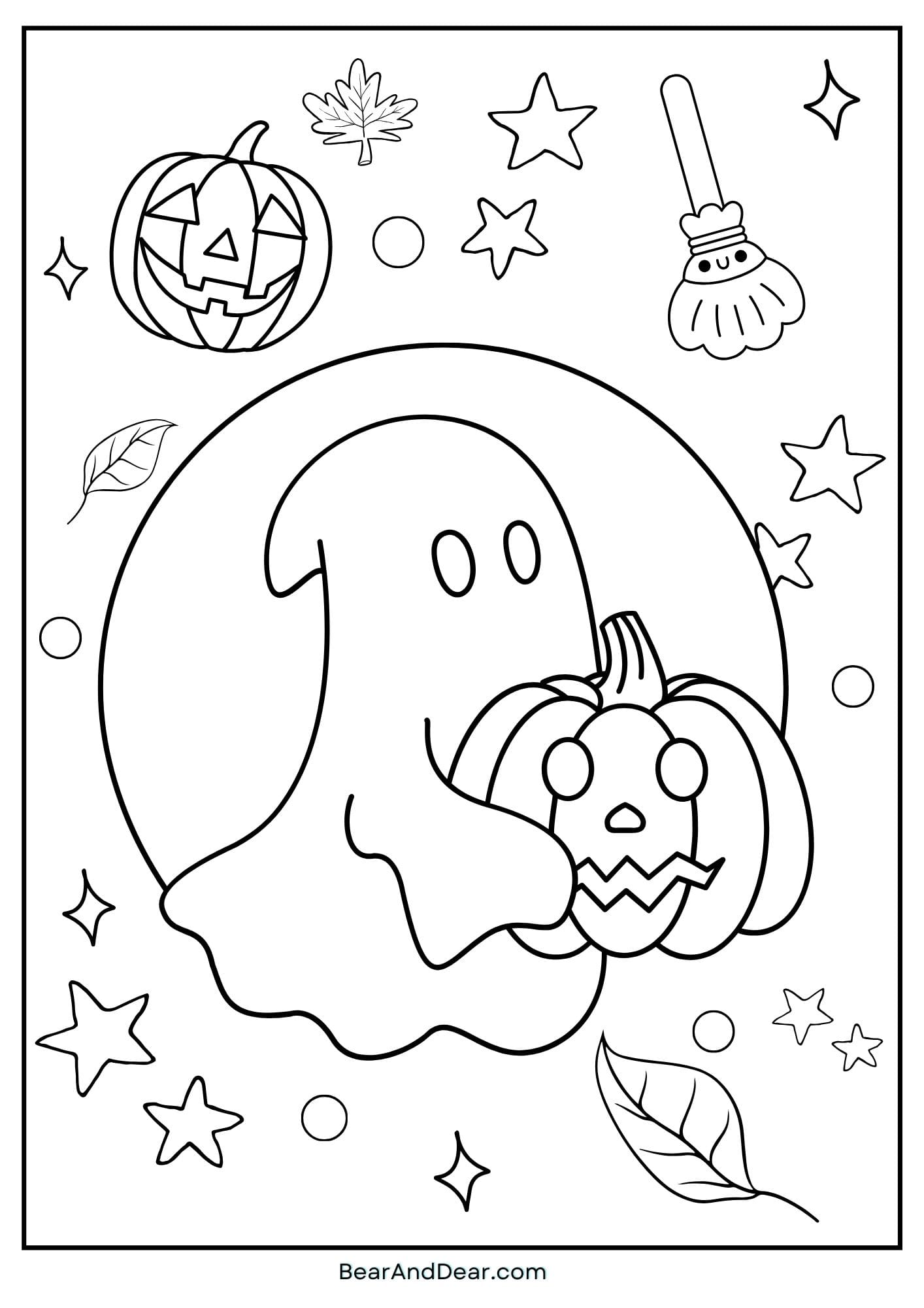 With this lovely coloring sheet of a cute ghost having a great time celebrating the night, you can embrace the magical spirit of Halloween. This merry specter, softly lit by the moonlight, dances beneath a starry sky while clutching a comical Jack-o’-Lantern.