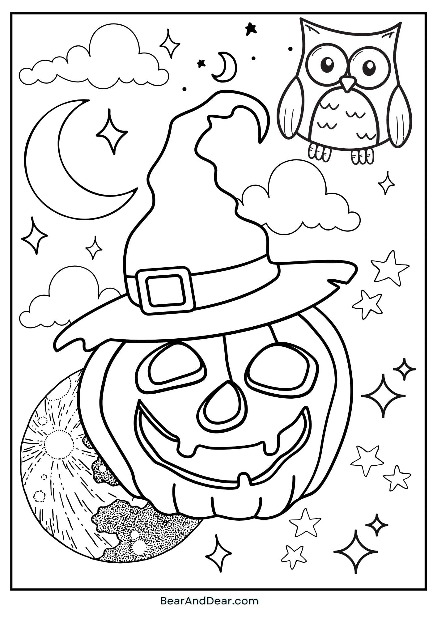 This Jack-o’-Lantern stood on top of the full moon. Surrounded by owls and sparkling stars, this dreamlike scenery captures perfectly the magic of Halloween night. Take your creativity to go crazy as you add colors to this pumpkin and turn it into a Halloween charm.